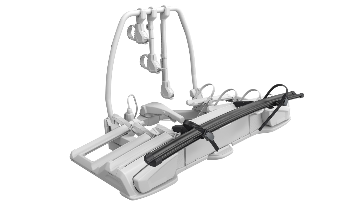 Securing your bikes onto the VeloSpace 3 Bike Adapter is simple, its full length wheel trays make loading bikes from one side super easy, with long wheels straps and ratcheting pump buckles to provide a secure hold to the carrier. A frame to frame clamp keeps your bikes secure and the bike frames evenly spaced, the ratcheting pump buckle straps providing a secure hold to each bikes frame is lockable for added security.